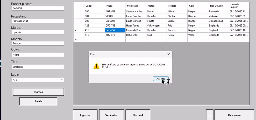 Implementación de un sistema CRUD completo con lógica de validación para 57 espacios parametrizados. El proyecto destaca por un mapa interactivo dinámico que visualiza el estado de cada cajón mediante estados de color y permite la recuperación instantánea de datos del propietario mediante interacción con el DOM.