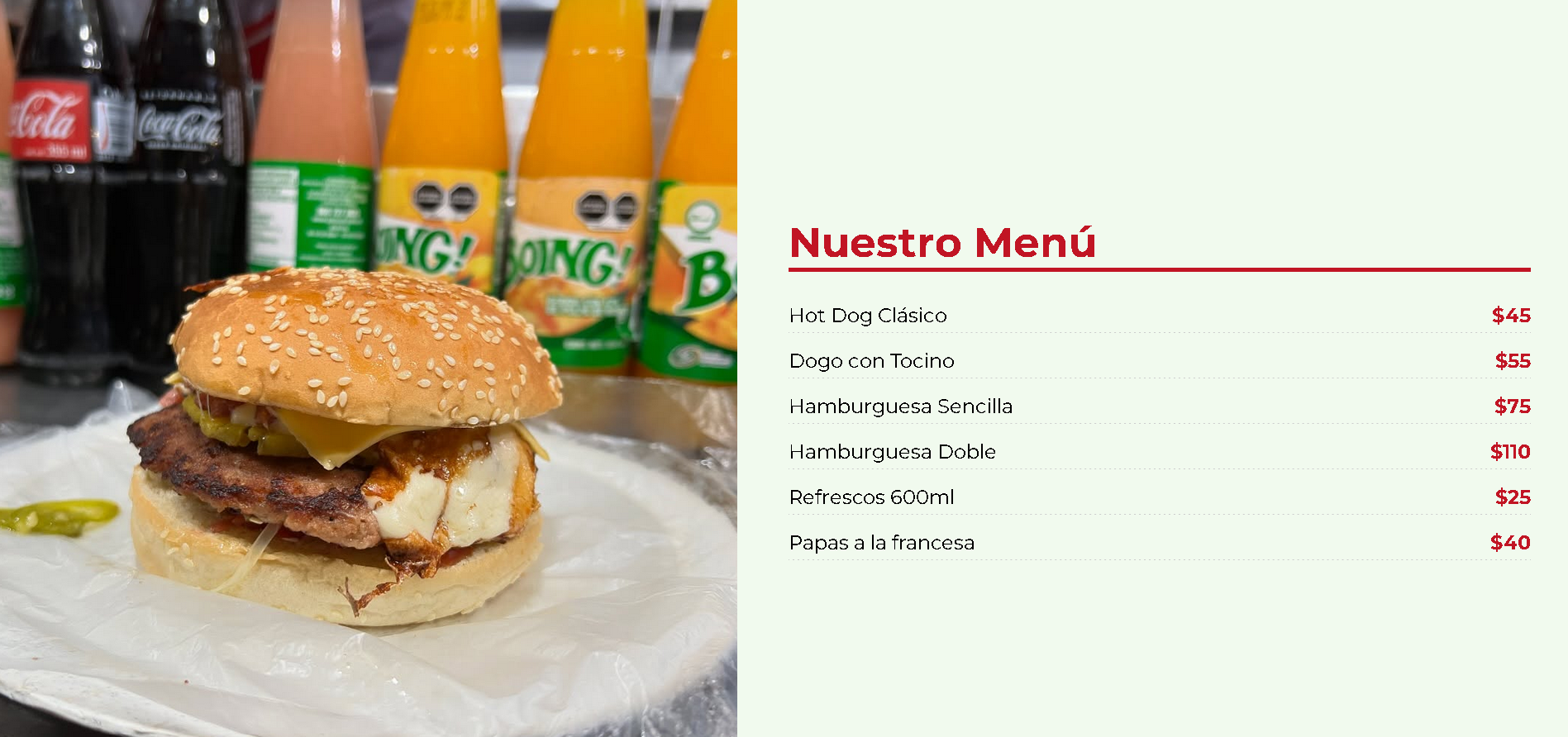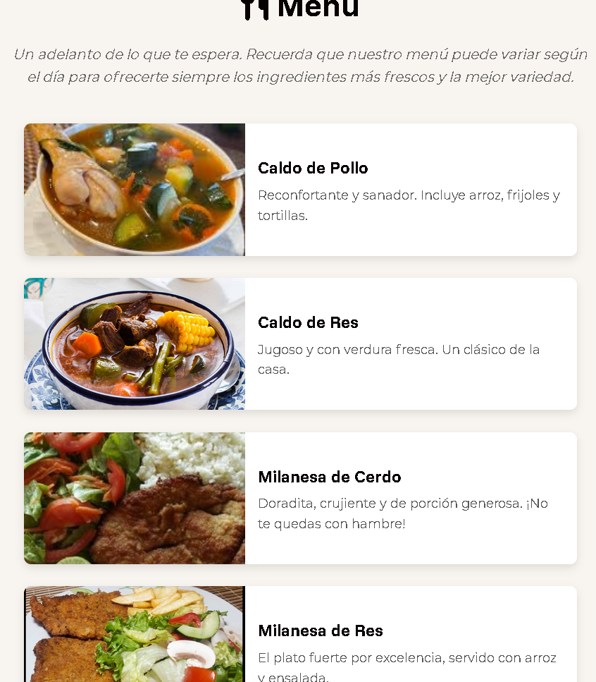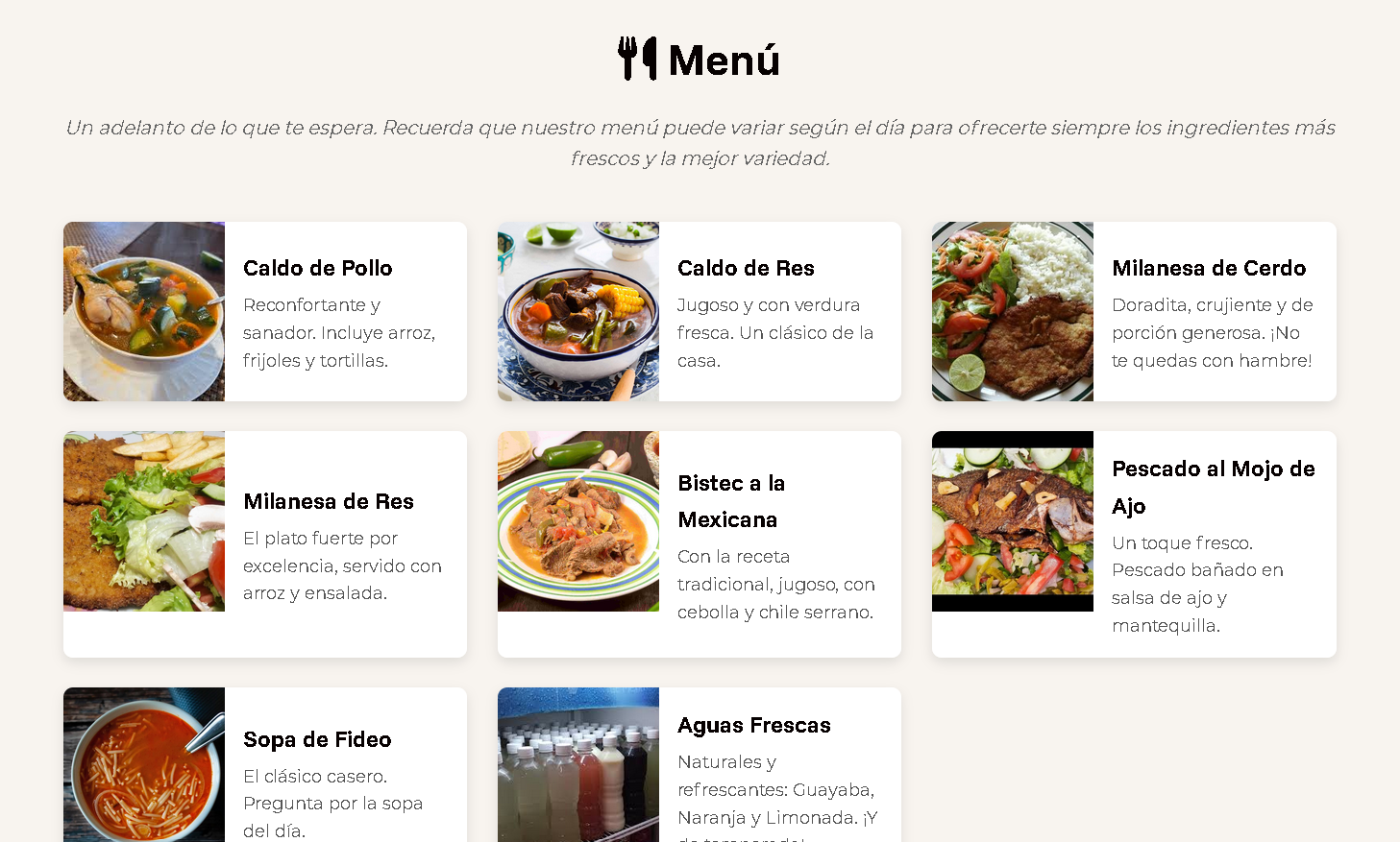 Enfoque en accesibilidad y claridad. Implementé un sistema de tarjetas dinámicas con CSS Grid (auto-fit) que organiza menús extensos de forma legible. El diseño responsivo ajusta automáticamente proporciones de texto e imagen para una experiencia móvil impecable.